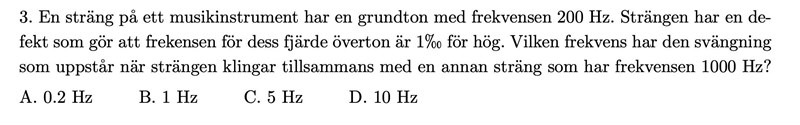 Av detta förstår man att fjärde övertoner alltså ska ha fem gånger grundfrekvensen eller 1000 Hz. På grund av defekten har den istället 1010 Hz och den hamnade således i svävning tillsammans med strängen som inte är defekt.