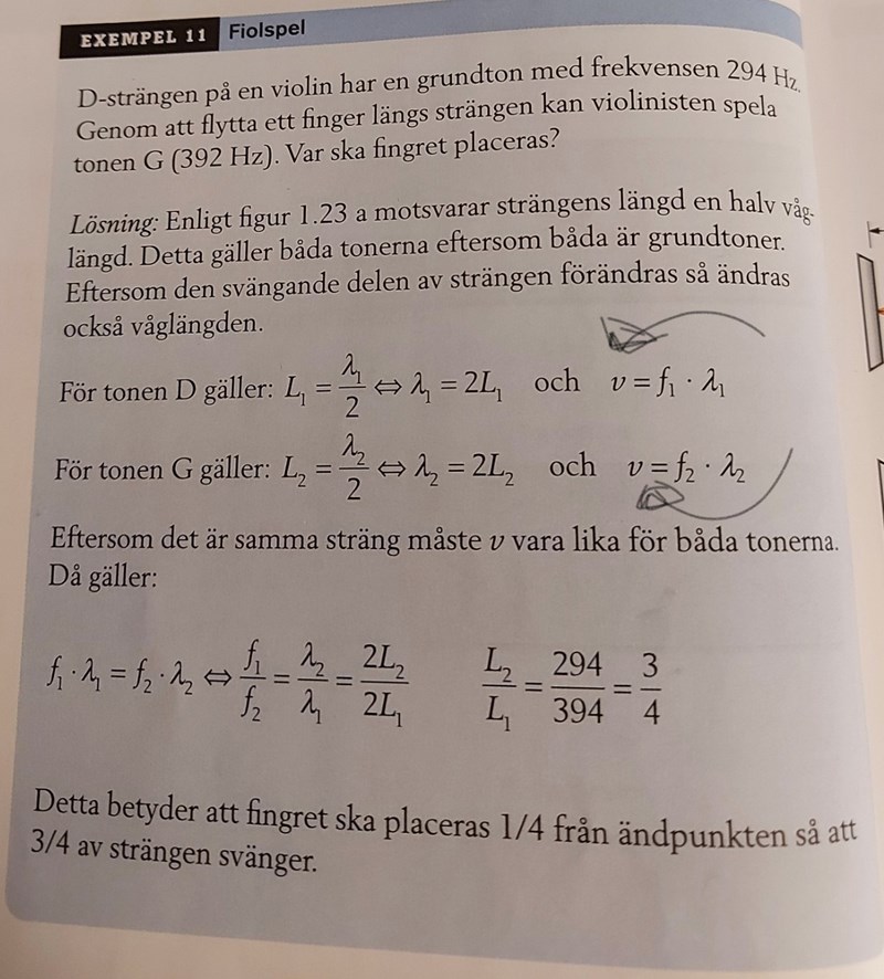 För en fiolsträng som svänger i grundtonen fås våglängden som exakt två gånger avståndet mellan ditt finger och där strängen är fäst på huvudet:
