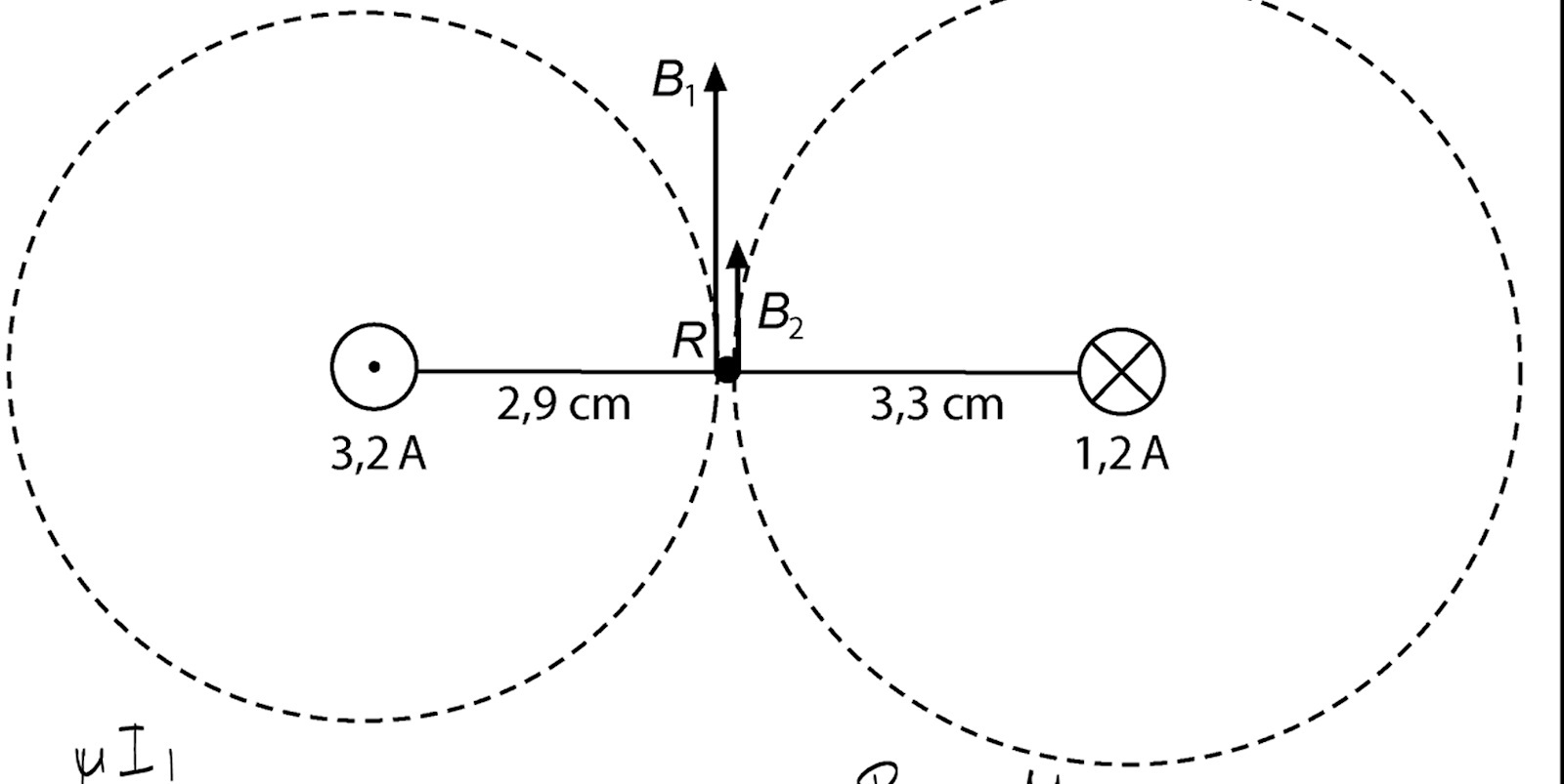 Knyt din högra hand så att tummen pekar rakt fram. Låt tummen peka i strömmens riktning (d v s ut mot dig, från pappret, för den vänstra ledaren. Vrid på hela handen (med tummen kvar pt samma håll) tills dina fingrar är i den punkt där du vill ta reda på fältets riktning. I vilken riktnning pekar dina fingrar? Upprepa för den andra ledaren - nu skall tummen peka in i pappret.![]()