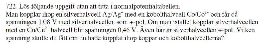Så skulle svaret bli om koboltelektroden var pluspol. Men jag vet ju inte vilken av dessa två som skulle vara pluspol. Jag förstår ju att en negativ potential innebär att det då måste vara koppar som är pluspolen, men tänk om man väljer två ämnen där spänningen blir negativ oavsett vilken man skulle vilja ha som pluspol, dvs. ingenting händer. Hur ska man veta att det inte är så här?