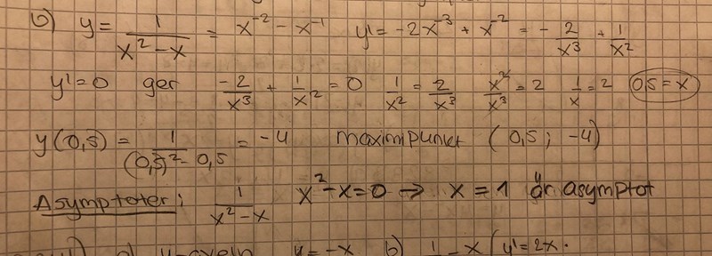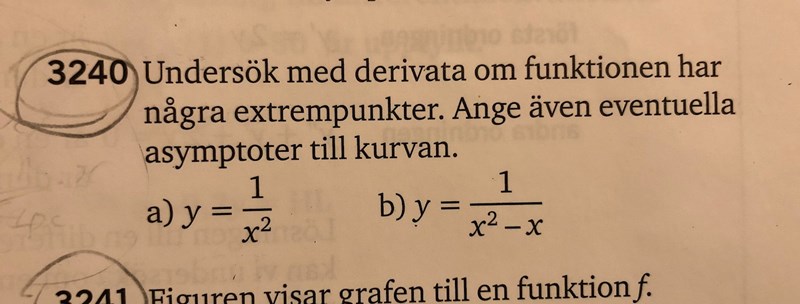 Jag har fastnat på b) uppgiften. Jag tog fram extrempunkten och att x=1 är en asymptot men förstår inte hur facit även säger att x-axeln och y-axeln är en asymptot? Hur vet man det?