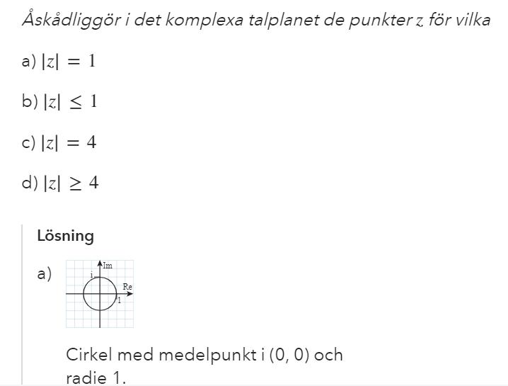 Är det för att ifall medelpunkten hade varit annanstans än i origo, så hade det framgått på något sätt, tex via ? Att eftersom inget fler tal än z står i absolutbeloppet så vågar man utgå ifrån att mittpunkten är = (0,0) och därför inte behöver skrivas ut?