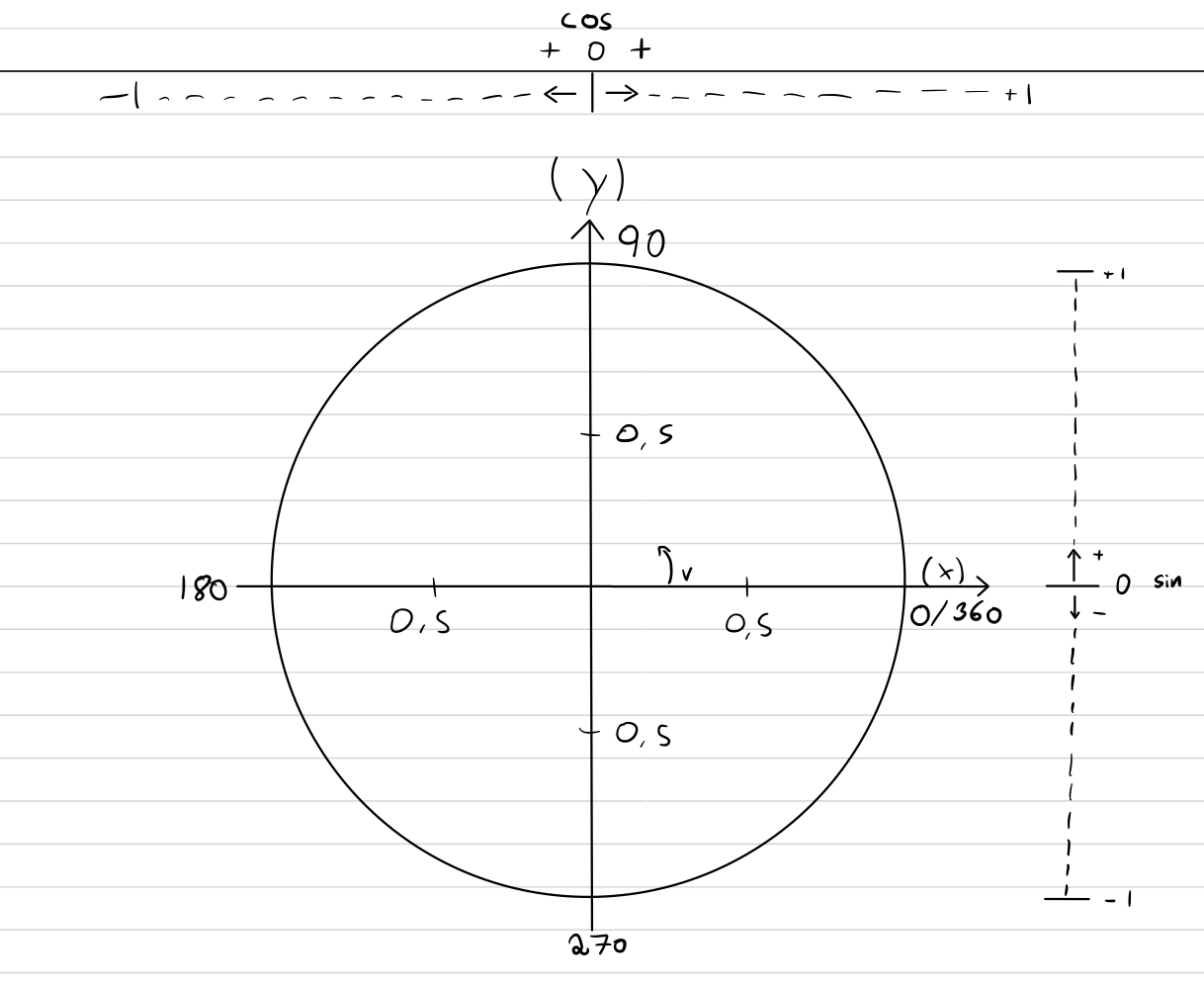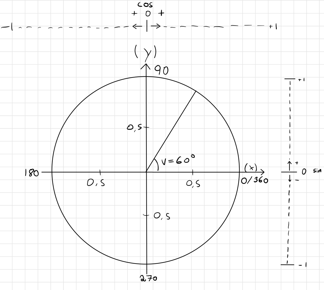 Låt (x, y) vara punkten på enhetscirkeln som radien pekar ut. För en godtycklig vinkel v gäller då att x = cos(v) och y = sin(v).