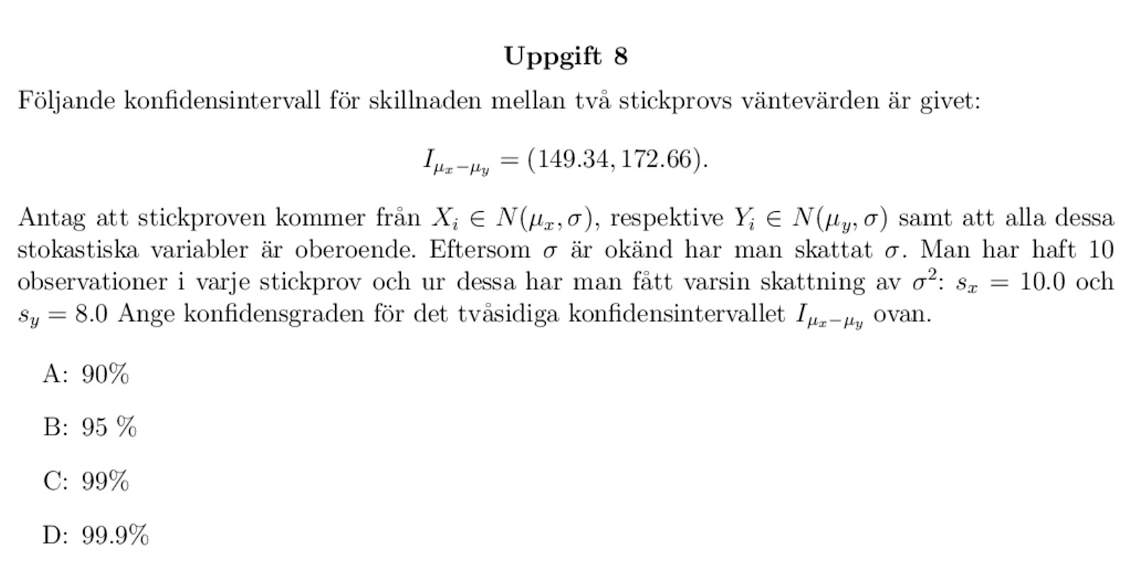 Kallaskull skrev:I detta fall har vi ju att X och Y har per definiton samma varians i vilket fall vi kan beräkna den poolade variansen, när jag tog statistik brukade uppgifterna vara tydliga i frågan huruvida vi kan anta att olika fördelningar har samma varians.