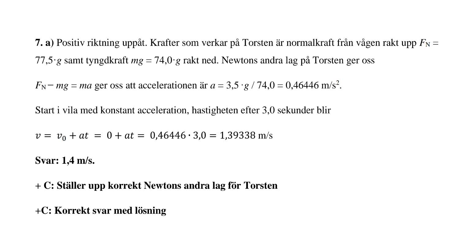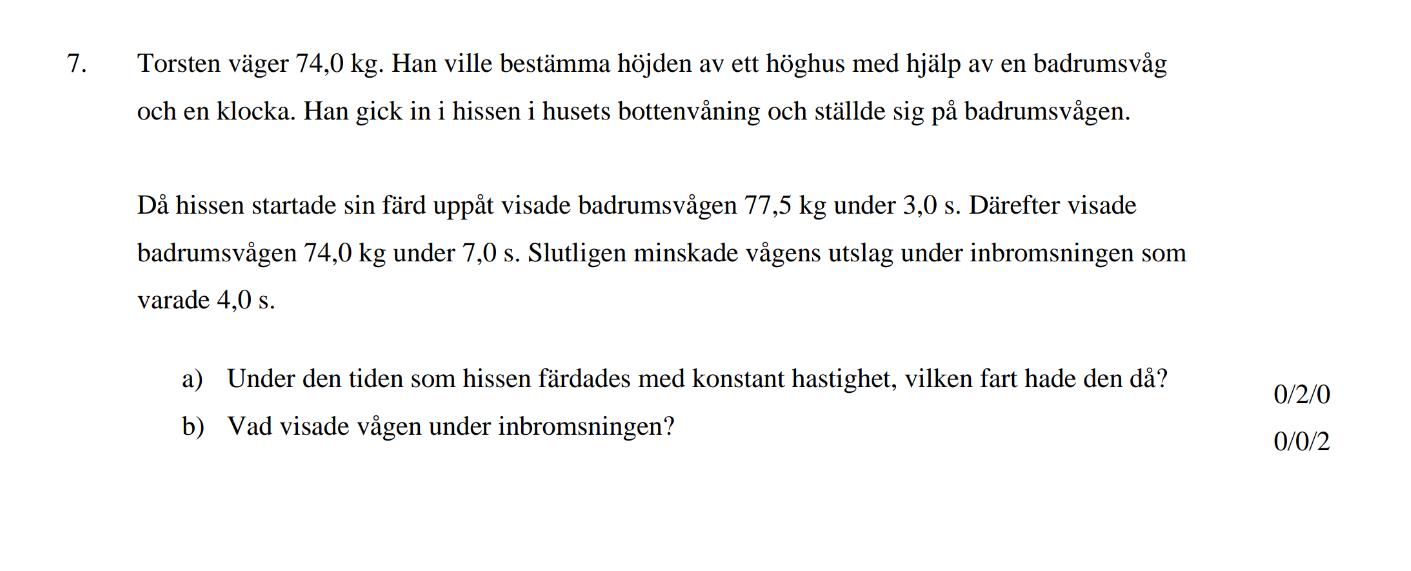 Det som sedan används är utslaget på badrumsvågen. Det är 77.5 kg trots att Torsten bara har massan 74 kg. Därmed är Normalkraften på badrumsvågen (från Torsten) större än Torstens tyngd vilket är för att hissen accelererar uppåt.