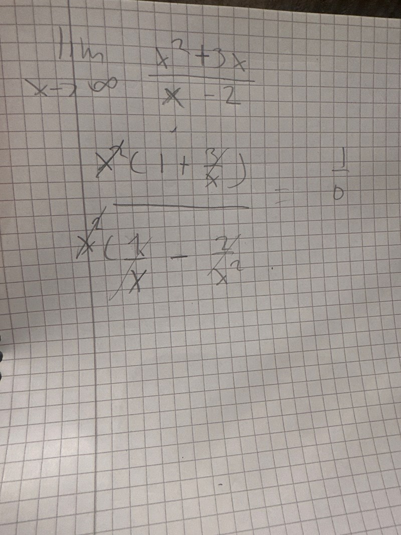 I din hantering ovan ser jag ett par fel när du bryter ut: x2+3x= x(x+3) och x-2=x(1-2/x), och kvoten däremellan går mot oändl när x går mot oändl, (det är x et framför +3 som går mot oändl.) så asymptoten syns inte. Håll fast vid regeln jag gav dig i mitt förra inlägg, så undviker du en onödig felkälla.