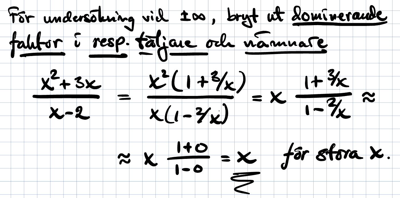 fast jag förstår ännu inte hur jag kan se om när funktion läggs i x lim går mot oändlighet- hur man ser om den är horisontell eller sned. Min lärare sa att när funktionen inte går att göra lim går mot x så är den sned sen ska man utföra liggande stolen , fast när är det ”fel”, är det när x finns kvar i täljare eller nämnare ?
