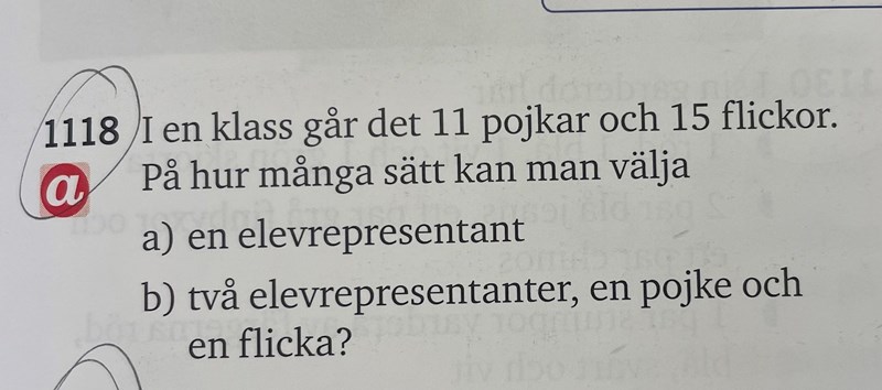 I b-uppgiften ska vi välja en pojke ur det första klassrummet och en flicka från det andra klassrummet. Att vi ska välja en pojke och en flicka innebär att vi måste använda multiplikationsprincipen. Därav är svaret på fråga 1118b C(11, 1) * C(15, 1) = 165. Skulle vi istället välja en pojke eller en flicka så är det additionsprincipen som gäller. "Och" och "eller" är därför ofta nyckelord som skvallrar om det är multiplikations- eller additionsprincipen som ska användas.