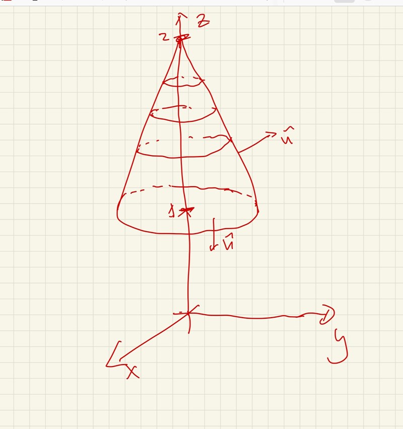 Du skall räkna ut flödet upp genom konens mantelyta. Om du lägger till basytan som ligger i planet z = 1 så får du en sluten volym som du kan tillämpa Gauss på.