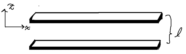 Jag håller på att studera ett elementärt exempel i fluiddynamik där man har en isotrop, Newtonsk fluid som strömmar laminärt och stadigt (ingen acceleration) mellan två parallella plattor med oändlig utbredning. Se schematisk figur nedan: