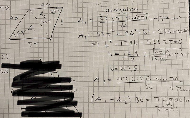 Vad för jag för fel? Värdet 33,5 meter tog jag reda på genom att använda cosinussatsen!