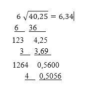Dela upp talet under rotmärket i grupper om två siffror från slutet. Hitta roten, så nära det går, ur första gruppen, som då kan ha en eller två siffror (40). Skriv den till vänster, under det en gång till, och efter likhetstecknet till höger. Skriv kvadraten i mitten (36) under första siffergruppen.