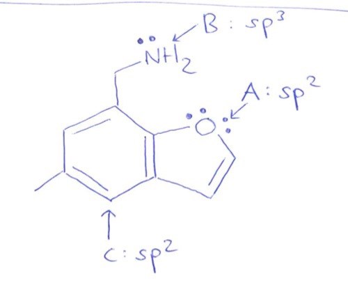 Så båda ringarna är aromatiska, och av syrets två ickebindande elektronpar upptar ett par elektroner en ickehybridizerande p orbital, och det andra elektronparet upptar en hybrid sp2 orbital.