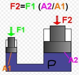 Här gäller det att trycket är lika på båda sidor, d v s F1/A1=F2/A2 där F betyder kraft och A betyder area, och 1 respektive 2 betecknar första och andra sidan.