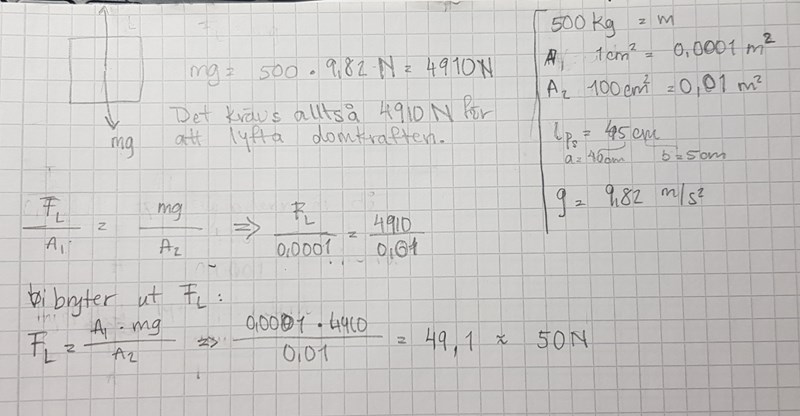 Du kan prova med att utgå ifrån att beräkna tyngdkraften av 500 kg (kraft=motkraft), dvs. den totala kraften som skulle behövas för att övervinna tyngdkraften. Sedan kan du tänka lite tryckmässigt