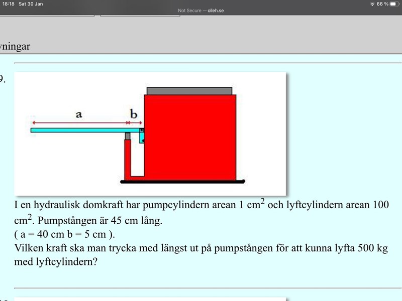 Du har räknat ut kraften som behövs om man trycker på stången rakt ovanför pumpcylindern, dvs. mellan pilarna, lite till vänster om där det står b. Men det gällde att man trycker längst ut på stången.