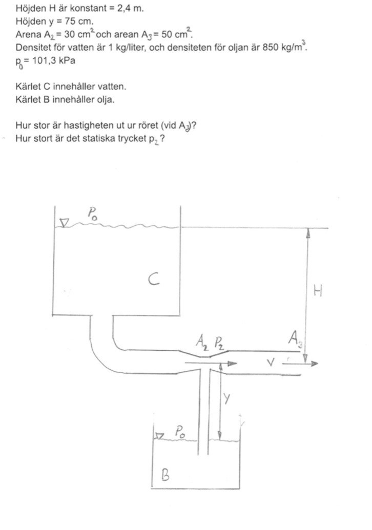 Om jag ska ta reda på V3(hastigheten) vid A3 ska man ta tryckskillnaden mellan vattnet vid venturimetern och oljan? Är hastigheten vid A1 = från där vattnet kommer från tanken?