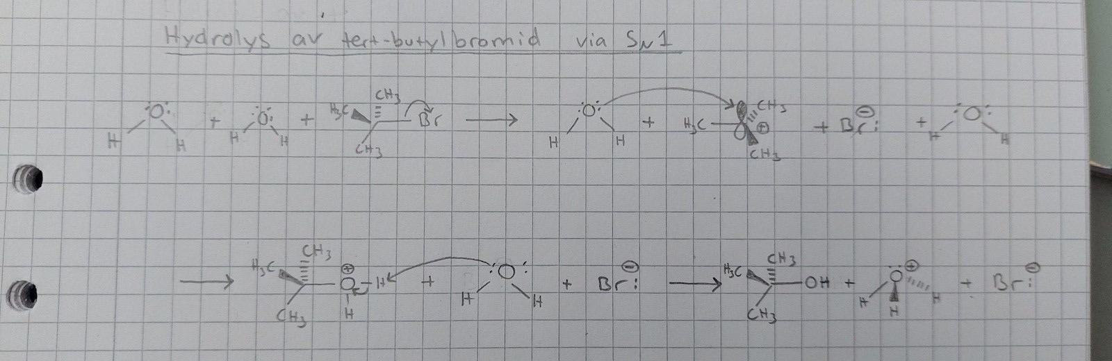 Jag undrar om följande reaktionsmekanism för SN1 för hydrolys av tert-butylbromid ser bra ut.