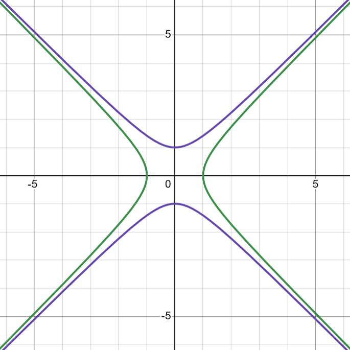 x2-y2 = 1 är grön. x2-y2 = -1 (samma sak som y2-x2 = 1) är blålila.