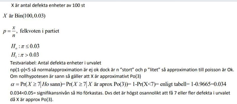 Min fråga är eftersom H0 förkastas och gäller. Alltså kan han påstå att firman har fel och felkvoten är större än 0.03. Borde det inte vara sannolikt då att få 7 defekta eller fler eftersom felkvoten är större än vad som påstås? Har jag fel eller facit? Kan någon förklara?