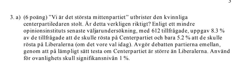 Jag har en fundering gällande frågan ovan. Det står "testa om Centerpartier är större än Liberalierna"