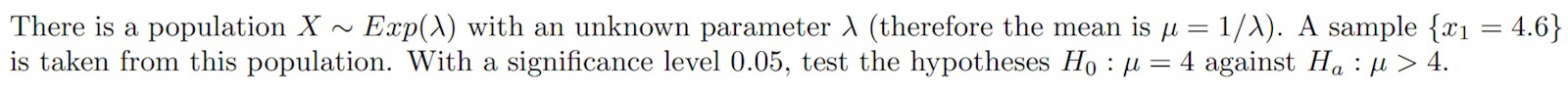 Vad är då samplingsfördelningen givet att H0 är sann? Jo, din test-statistiska är en expontentialfördelad variabel med medelvärde 4, och om du då upprepar testet många gånger kommer din statistika följa en exponentialfördelning med medelvärde 4.