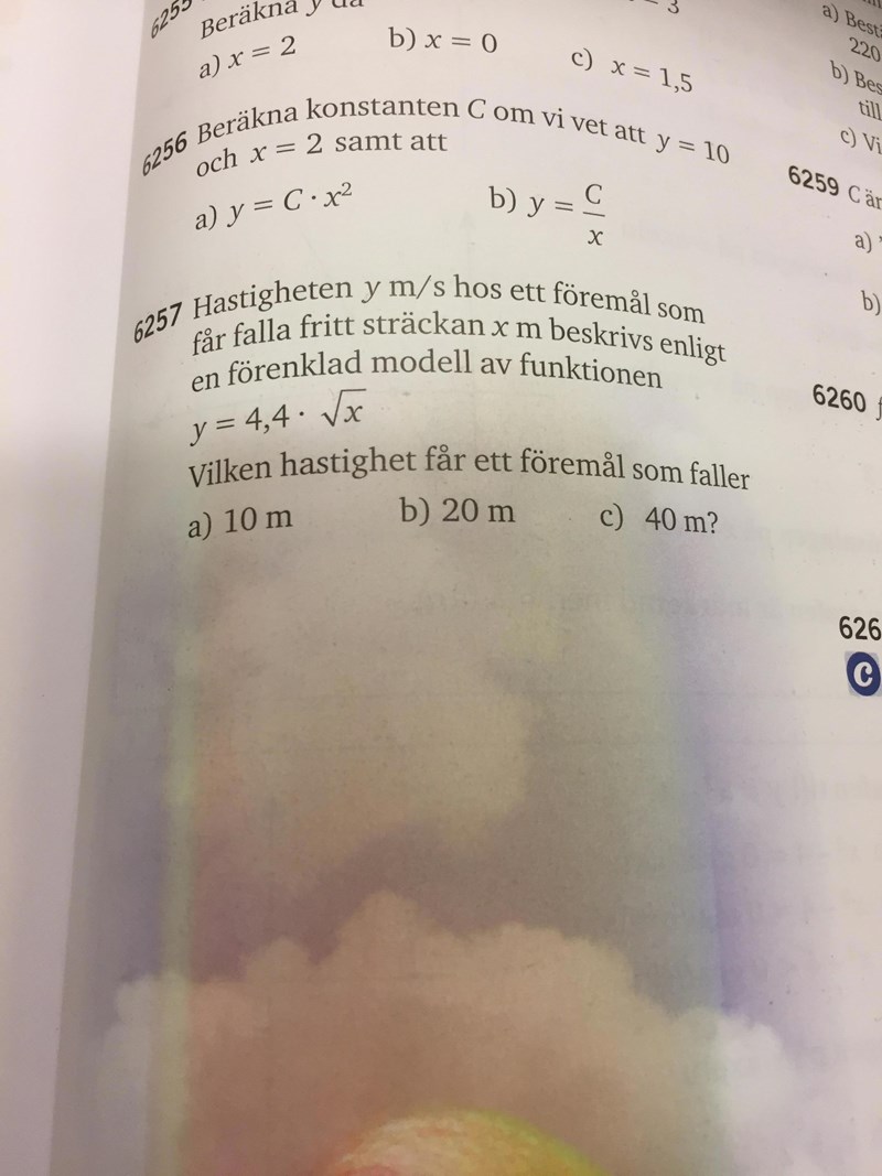 Då föremålet har fallit 10 meter (dvs då x = 10) så har det uppnått hastigheten y = 4,4*rotenur(10) meter per sekund.