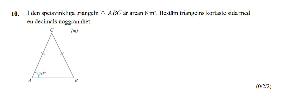 Så jag använde sedan av area satsen då jag antog att AC och BC hade längden X, så med hjälp av area satsen fick jag 8 = X*X*sin40/2, men det blir fel. Hur ska man komma till rätt lösning. Facit säger 4,4 m