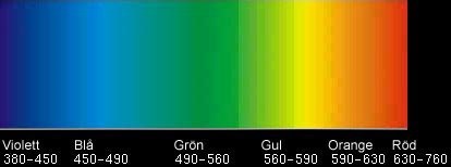 Vilken färg ljuset har beror på våglängden, 400nm är lila eller violett och 700nm är rött.