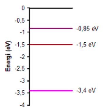 om elektronen hoppar från -3,4 eV till -1,5eV med den tillförda energin 1,9 eV
