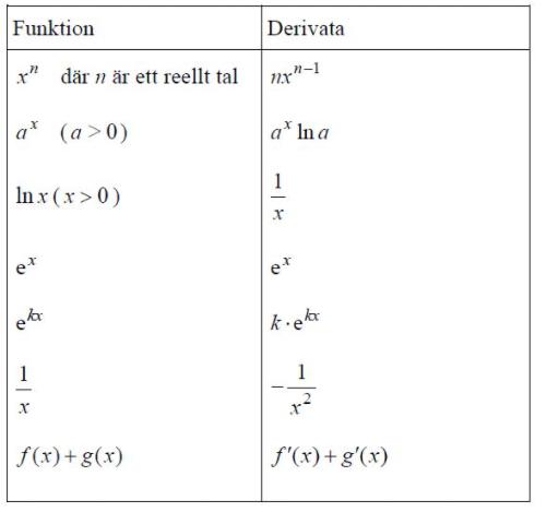 Aloosher skrev:Du måste inte använda derivatans definition/formel (minns inte namn) för du får en formelsamling vid ditt kursprov som ger dig alla regler gällande derivering: