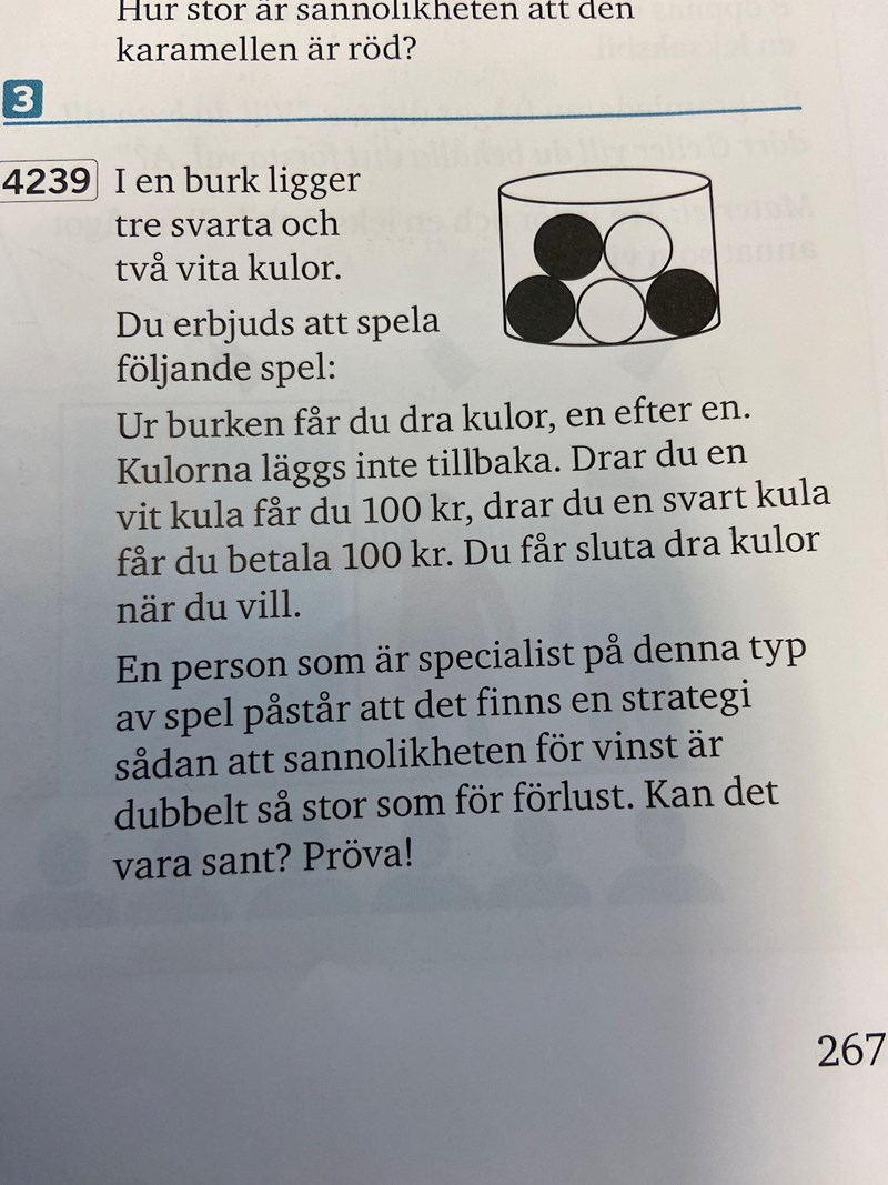 vilket gör att chansen för vinst är lika stort som förlust, men det stämmer inte enligt facit.