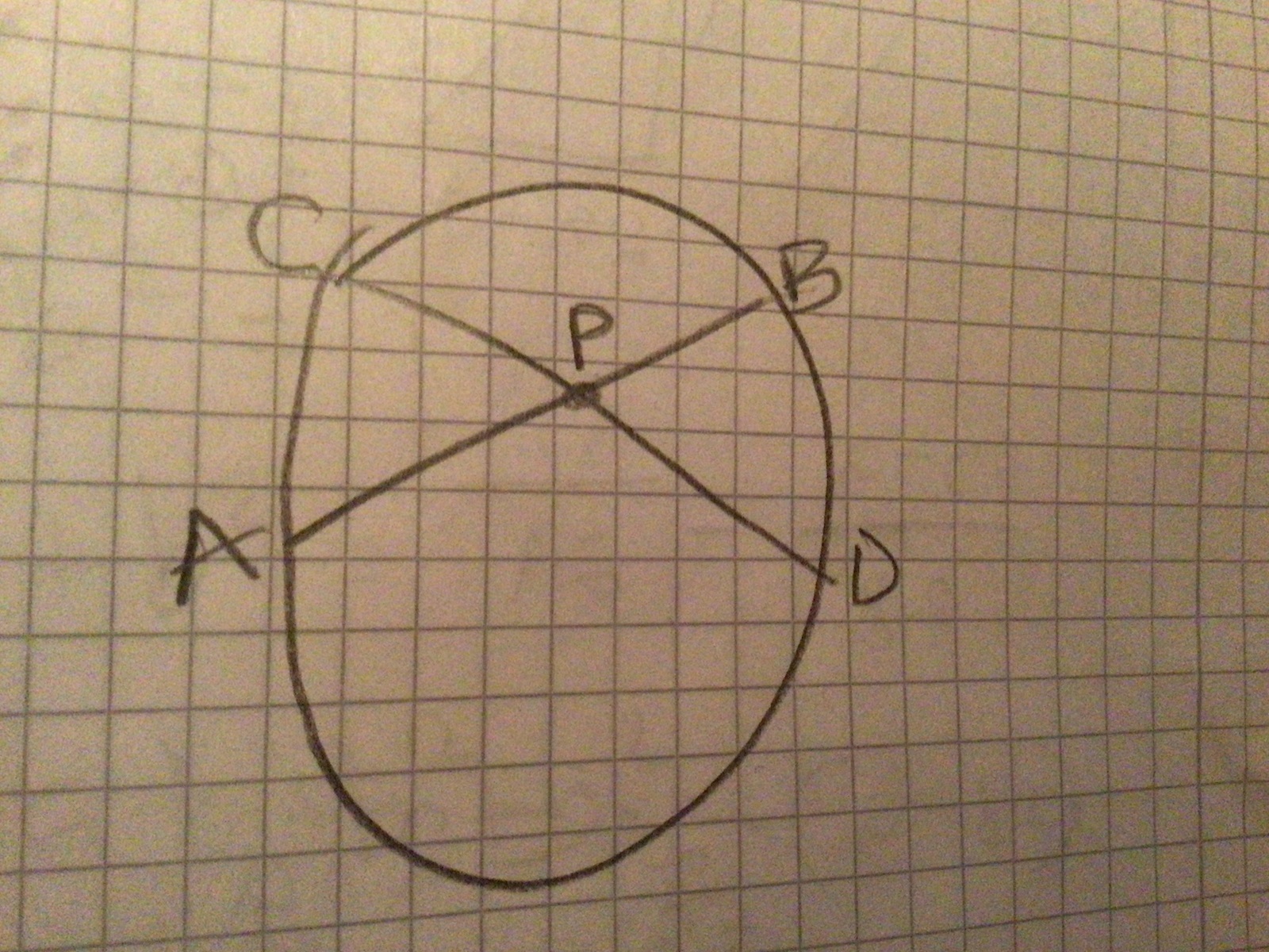 I en cirkel dras två kordor AB respektive CD som skär varandra inuti cirkeln i en punkt P. Visa att AP*PB=CP*PD
