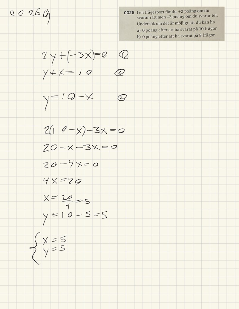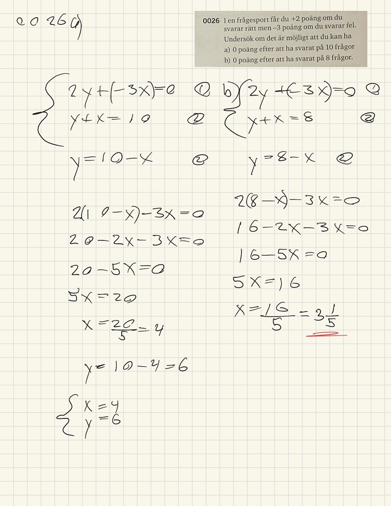 Jag tänker som följande. Men lösningen till ekvationsystemet är orimligt eller snarare rentav felaktigt.