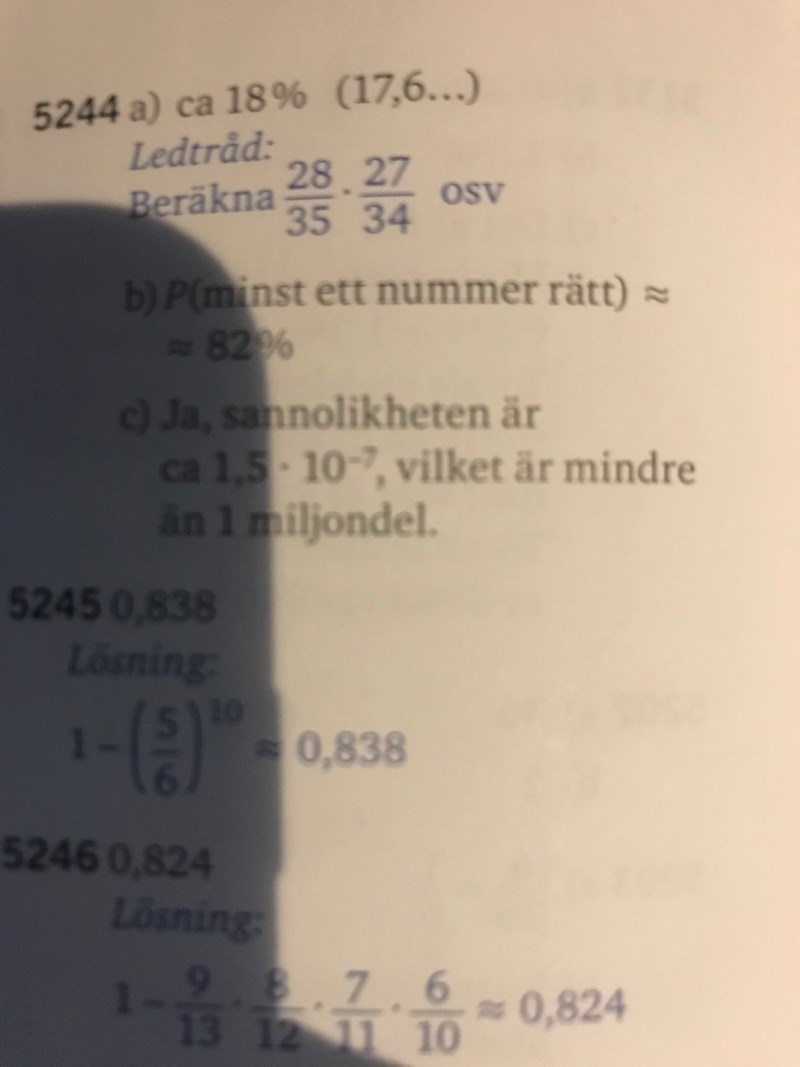 Men uppgiften klargör inte att det är 7 nummer som man ska välja och sedan får man rätt på dessa nummer i dragningar. Hade inte uppgiften kunnat förklara spelet Lotto för oss Lotto-okunniga? Med denna beskrivning uppgiften givit är det inte helt klart att man ska spela efter dessa premisser. Det är så att man kan uppfatta att man kan välja 7 nummer och sedan dras de i en omgång och så är det färdigspelat. Då är sannolikheten för vinst 7/35 och för förlust 28/35, men bollarna ska dras i 7 omgångar. Hade inte uppgiften varit förtjänt av en ganska simpel förklaring, att av 35 bollar får du välja 7 nummer som du får rätt på, och det görs 7 dragningar. Hur hög är sannolikheten att du får alla rätt respektive alla fel?