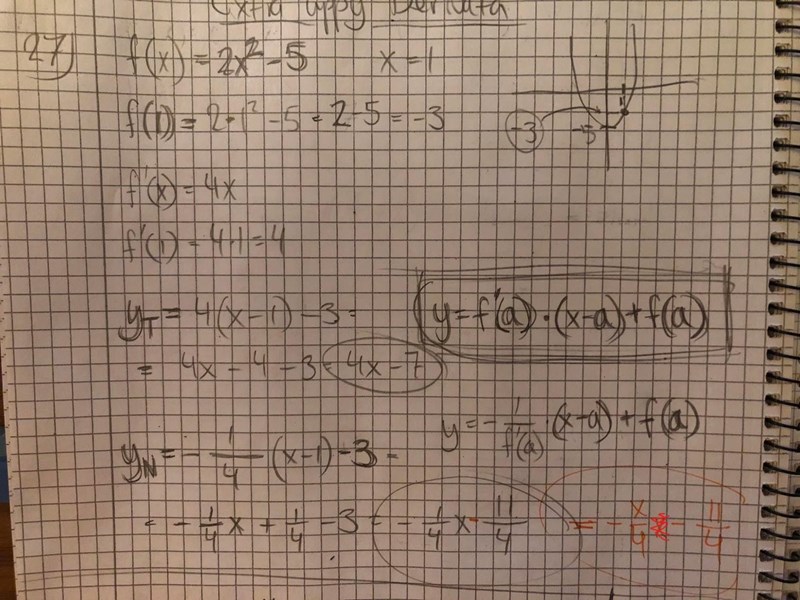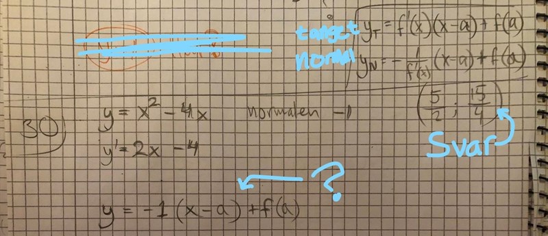 Hej! Kan någon ge mig lite tips om hur jag ska göra. Står helt still i hjärnan med denna. Har tagit fram ekvation för normalen och tangenten som jag tar med här. Men nu ska jag gå baklänges väl? Vet inte riktigt hur jag ska tänka. Uppgift 30 är det jag vill ha hjälp med. Tog med 27 för att där finns kanske något jag kan använda.
