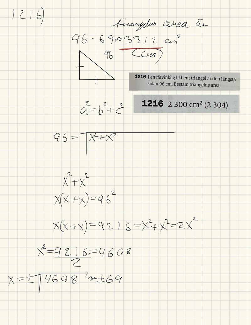 Efter mycket om och men så började jag undersöka mer grundläggande saker och behövde googla detta och tror jag aldrig stött på en uppgift där höjden inte stod angiven eller där man inte behövde mäta höjden om du förstår. Så kateter i kvadrat. Det visste jag faktiskt inte!
