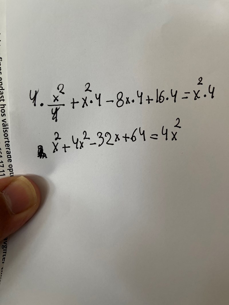 När du multiplicerar med 4 i båda leden så måste ALLA termer i VL multipliceras med 4, vilket betyder att även x^2 och -8x och +16 ska multipliceras med 4.
