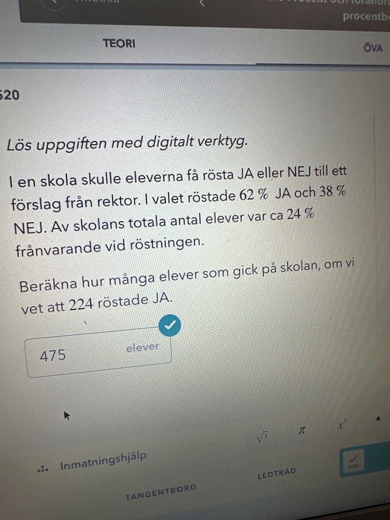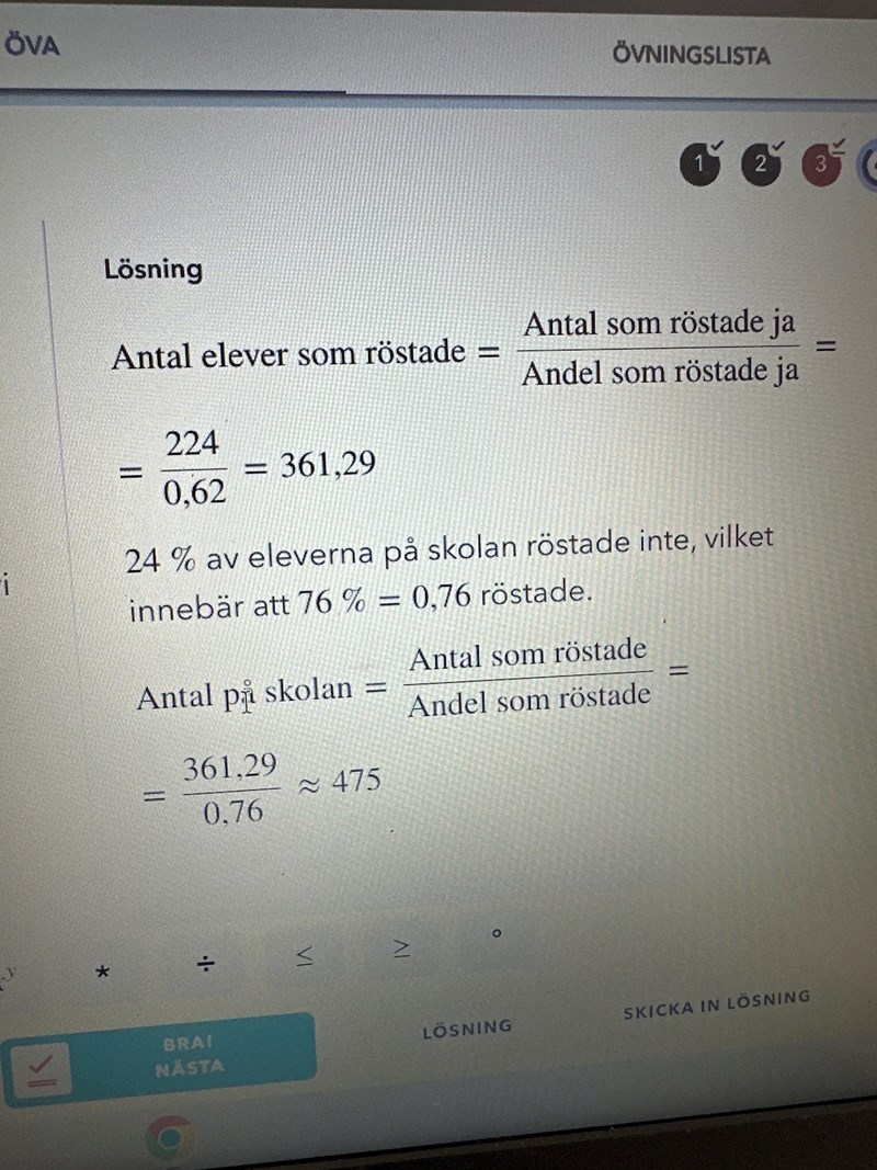 De elever som inte röstade (24%) har räknats med i den andra divisionen. I första steget räknas antalet röstande elever ut, till 361,29 stycken.
