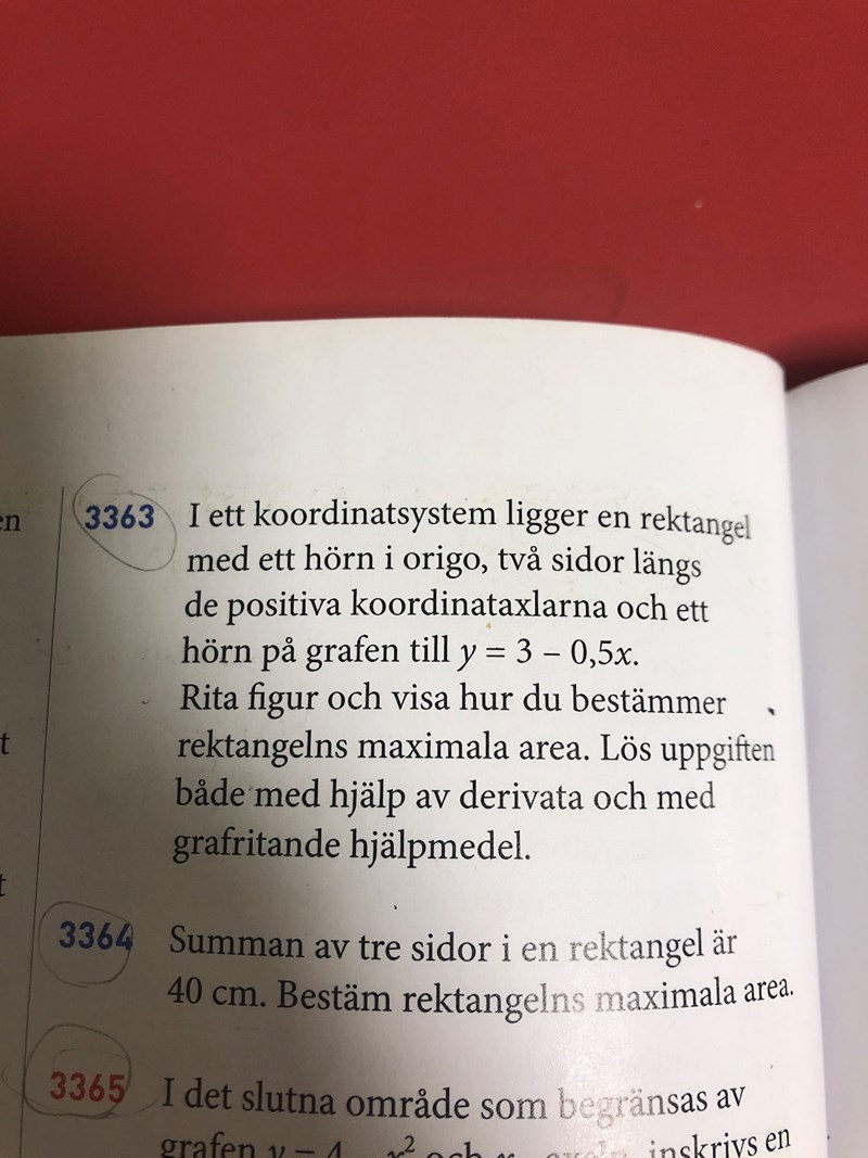 Så om rektangelns bas är x och höjden är 3-x/2, så är rektangelns area ...