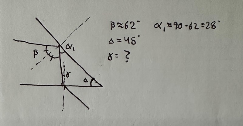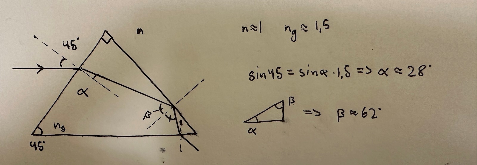 Men jag förstår inte hur jag ska komma vidare, varför ska jag ta 62-45? Jag antar att jag ska försöka ta fram infallsvinkeln för när ljuset går från glaset ut till luften, men jag vet inte hur jag skulle kunna göra detta. Jag försöker skapa någon rätvinklig triangel men till ingen nytta.