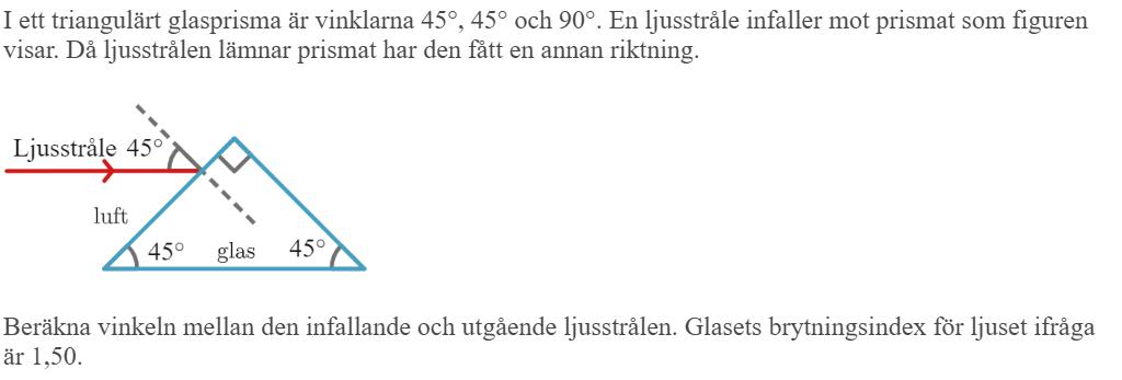 Sedan undrar jag också hur man vet att det kommer att ske totalreflektion, det finns en förklarning i facit men jag förstår inte den. Måste beta-vinkeln vara mindre än/lika med 90 grader? Om så, varför?