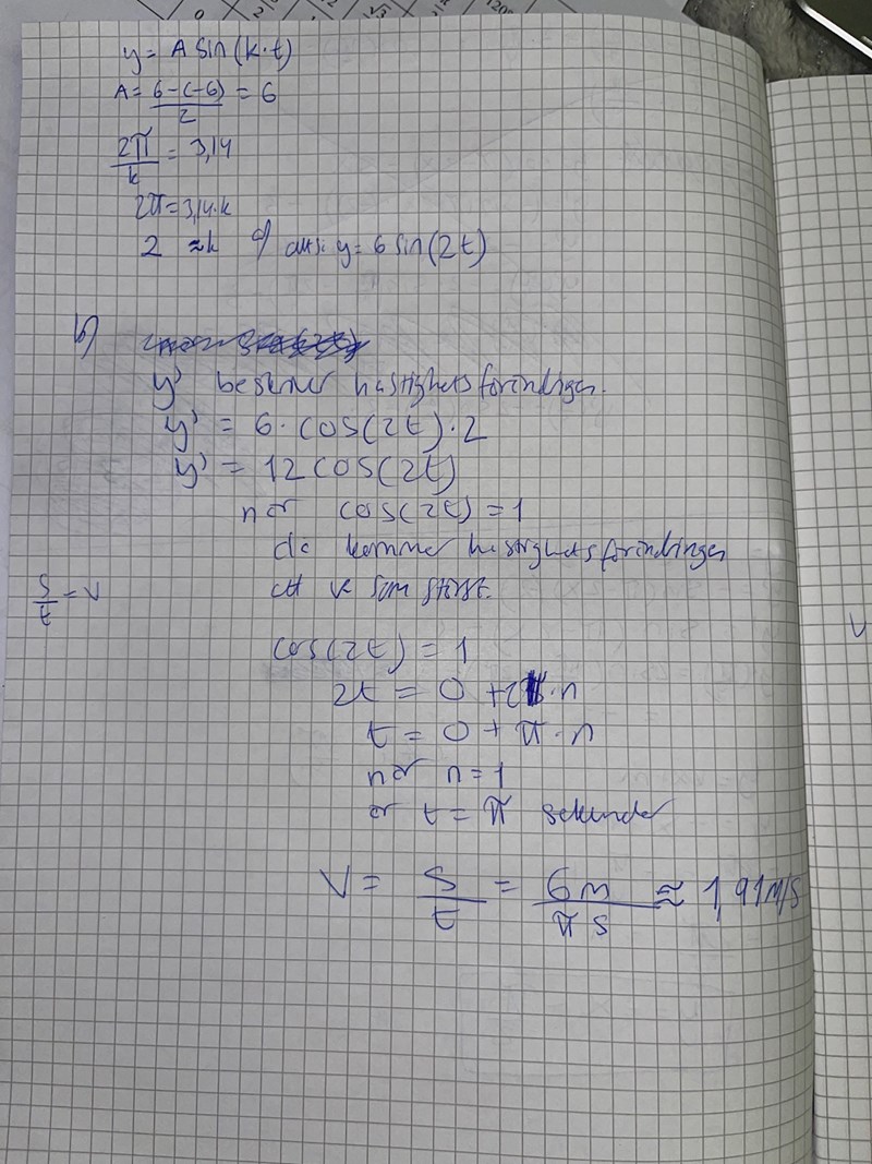 vid ett vågkraftverk rör sig en flytande boj upp och ner sinusformat. tiden för en svängning är 3,14s och avståndet mellan högsta läget är 6,0m.