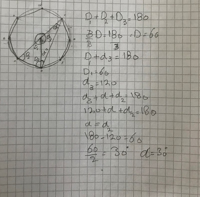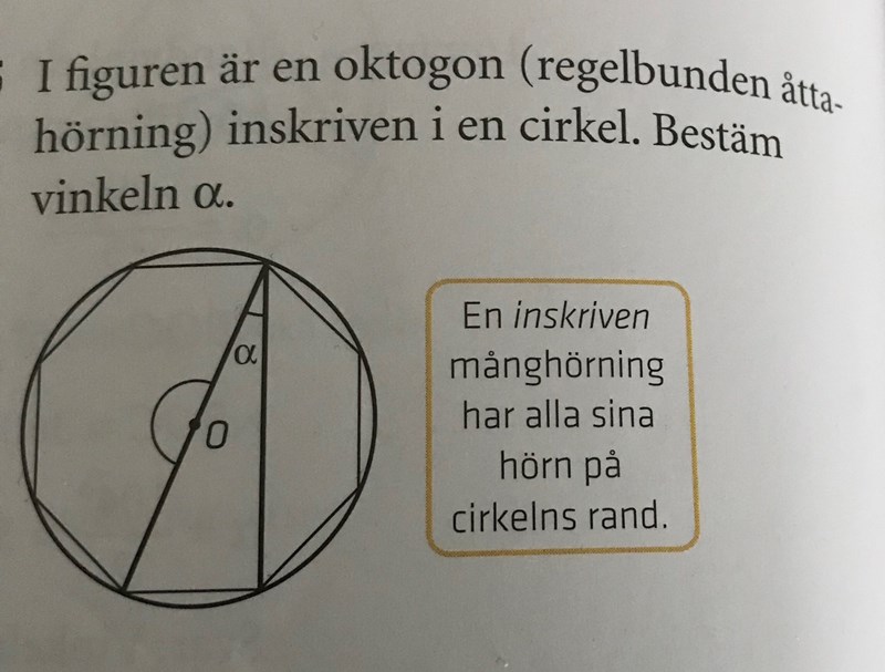 Ja, tack! nu förstårD1=3608=45. och a3= 3*45 =135. Så 135+a2+a= 1802a=180-1352a=45a=452=a=22,5 Eftersom a och a2är likben och har samma vinkel grade.