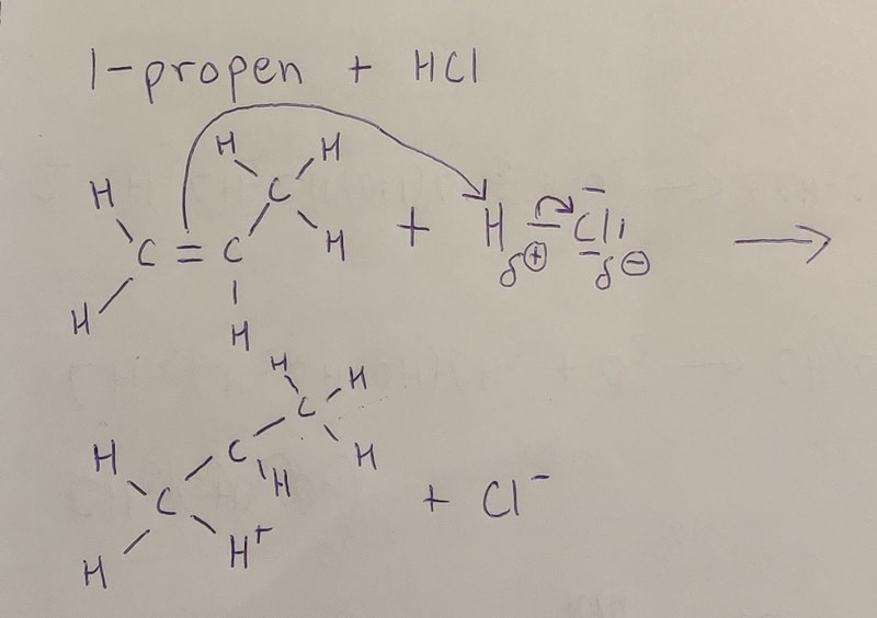"1-propen får reagera med väteklorid. Skriv reaktionsformel och reaktionsmekanism för produkterna samt motivera varför dessa bildas."