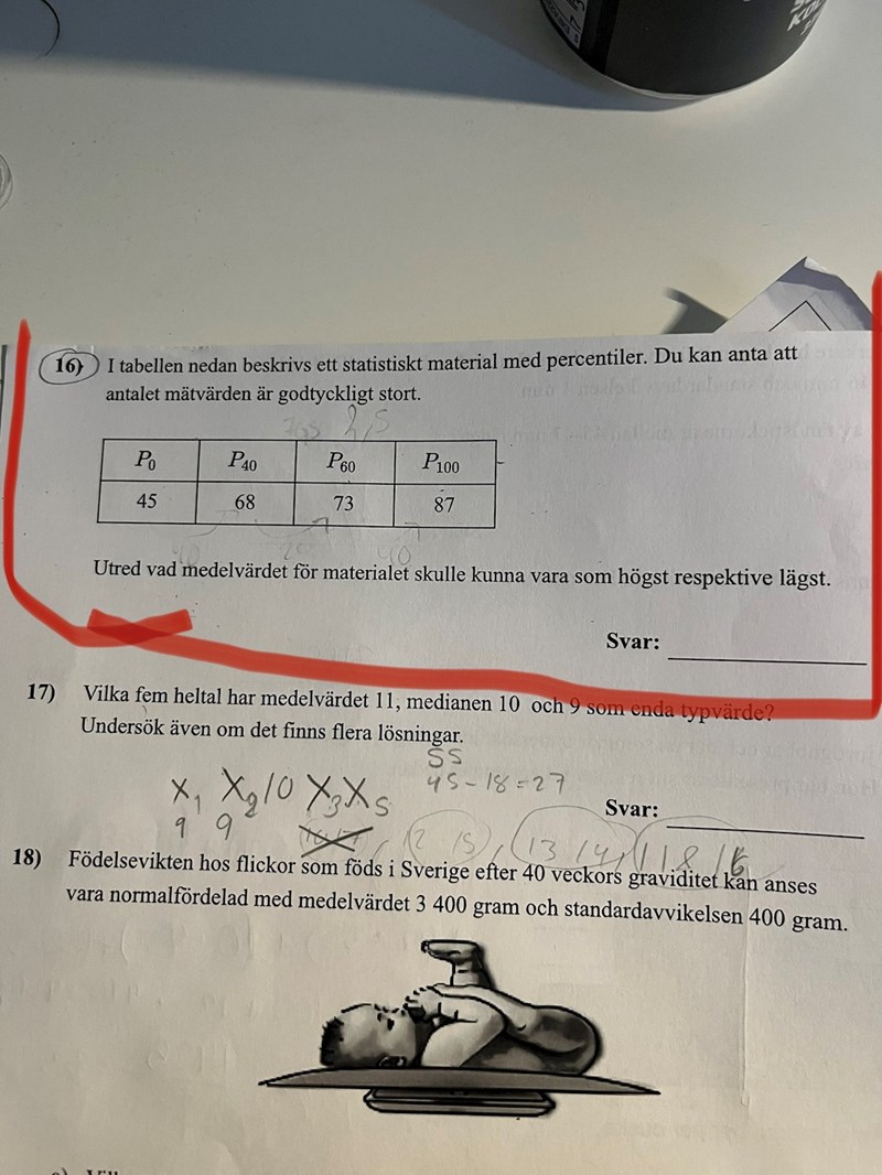 - Det är 0.2n mätvärden mellan P40 och P60 och de har ett värde på 68<x<73.