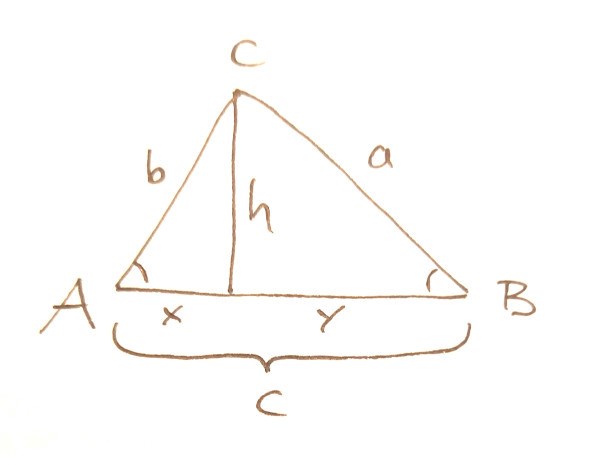 Nu kolla på skissen och du ser att x=h*ctgA och y=h*ctgB, och c=x+y