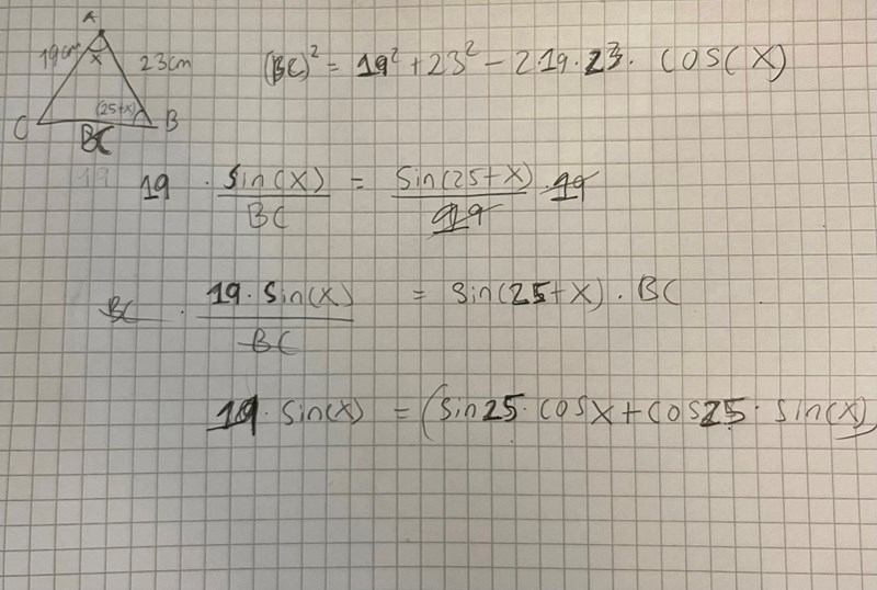 I triangeln ABC gäller att AB=23 cm, AC=19 cm, och vinkeln B är 25 grader större än vinkeln A.