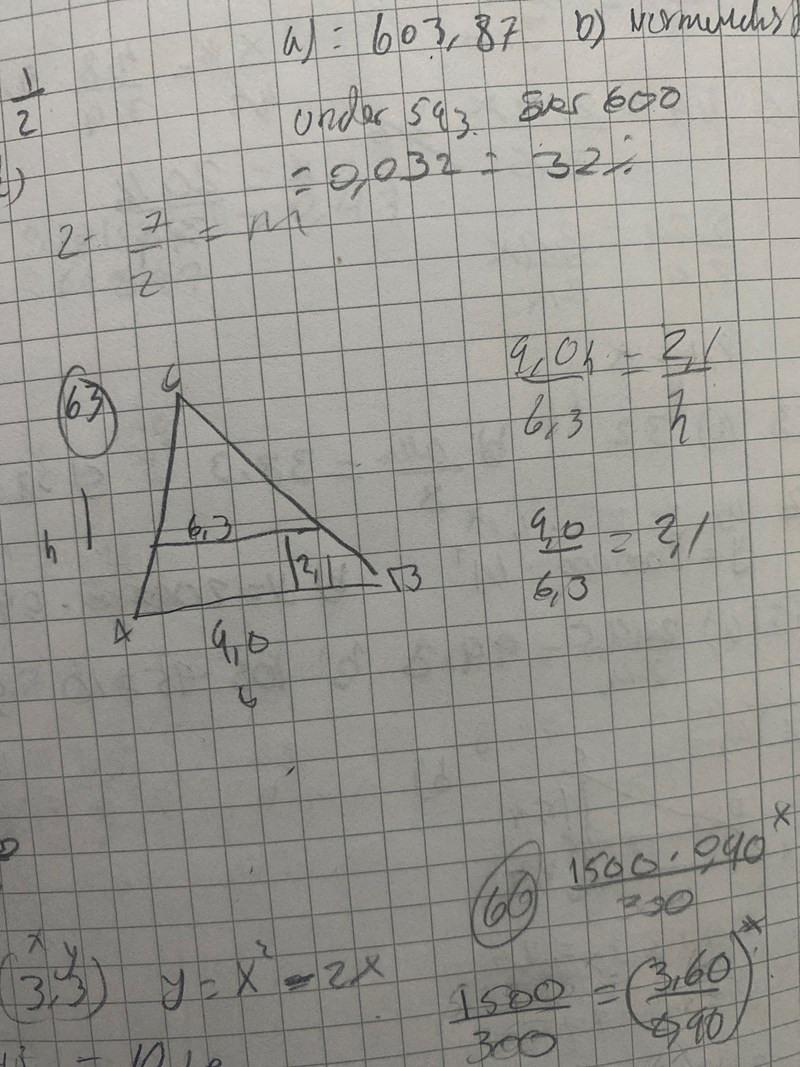 I triangeln är sidan med längden 6,3km parallell med sidan som är 9,0 km bestäm höjden h.