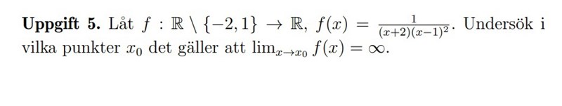 Hej, jag undrar med uppgiften ovan. Intuitivt började jag med att checka intervallets tal i funktionen och kom fram till att det verkar som att funktionens gränsvärde är oändligt vid -2 och 1. Men hur ska man egentligen komma fram till det?